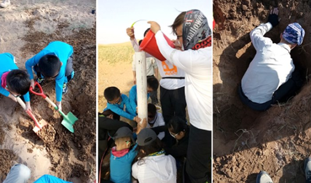 沙漠湖畔,是打井的理想之地,齐心协力挖沙,很快就会有地下水渗出,轻轻松松收集三大桶水。收集好了水,然后上道具,塑料管、乒乓球还有大朋友小朋友的齐心协力,沙漠甘泉游戏,搞定。