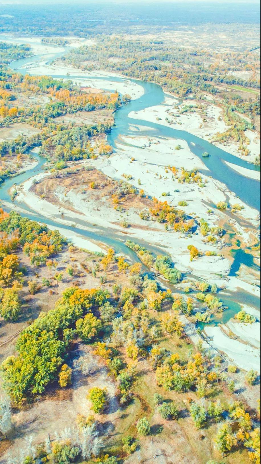额尔齐斯河就是这么一条走不同寻常之路的河流。一路呼啸奔腾,奔着北冰洋而去的它,也滋养了两岸的土地。这里实在太适合航拍了,随手一按就是一张媲美明信片的风景大片。