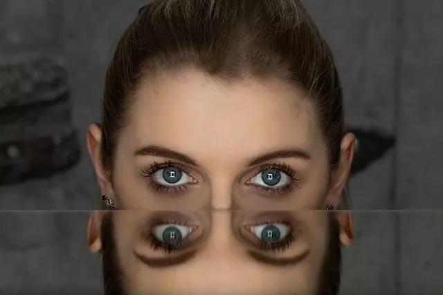 比如说,让拍摄对象竖着拿镜子,把镜子垂直于地面地放在脸部中轴线上: