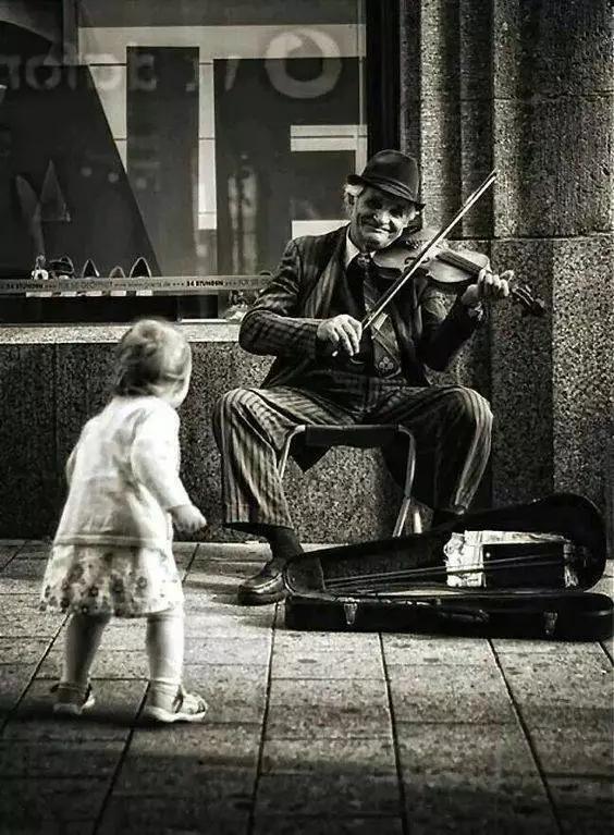 大街上,流浪的老爷爷拉着小提琴,路过的小孩跟着音乐,欢快地跳起了舞。