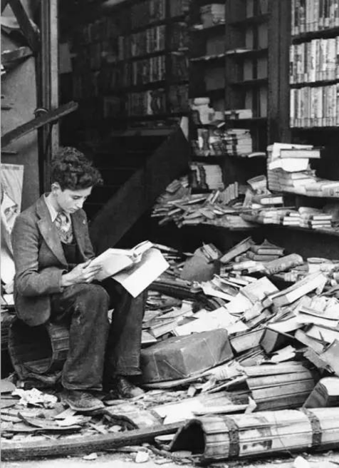 被炸毁的书店里,书籍散落了一地,一片狼藉里,一个少年正坐在那安安静静地看着一本书。