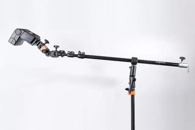 如果有灯架,把闪光灯放在灯架上——最好是拿着带吊臂的,这样可以让你的闪光灯实现更多角度的自由照明;没有专业的灯架的话,至少也要把闪光灯放在平整、稳固的平面上,以确保它不会翻倒。