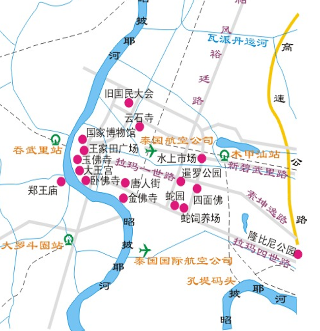 曼谷的市区主要景点如大皇宫、玉佛寺、卧佛寺、郑王庙都在西部,即湄南河两岸