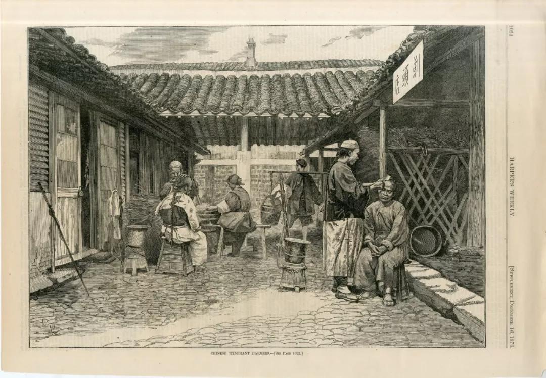 威廉·桑德斯作品《上海理发店》,摄影版画/蛋白照片,30×41 厘米,1876,原作由 Laura Huang 收藏
