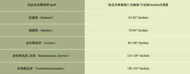 其最低含糖量的标准用予思勒(Oechsle)来表示,一度予思勒表明一升葡萄汁比一升水重一克,具体标准如下(其范围是因为各产区标准不一):