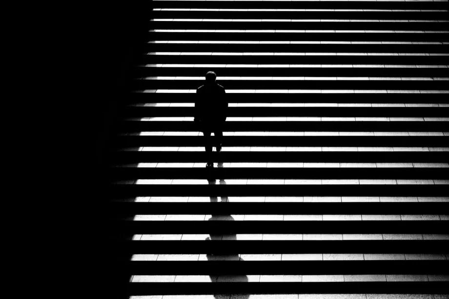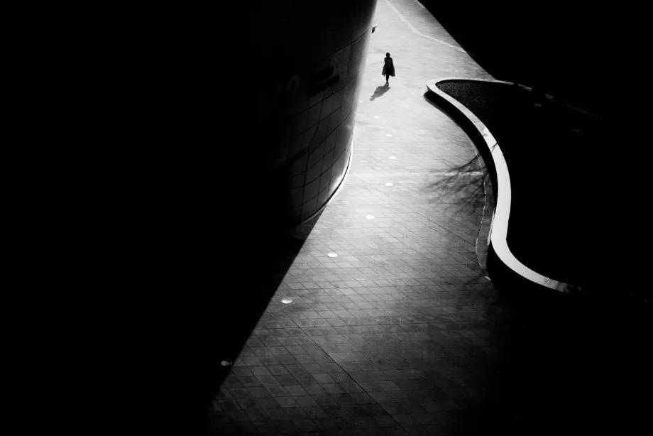 摄影图片:摄影师Junichi Hakoyama十分擅长拍摄高对比度黑白街头作品,善于利用场景中建筑物的线条,结合光影而形成明暗对比,加上充满故事性的单个人物融入其中,便成就影像拥有黑白默片的快感。