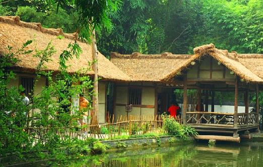 来到草堂的正门,就看见一条波光粼粼的河流从门前环流而过,这就是杜甫诗中多次提到的浣花溪。说到“浣花溪”这个充满诗意的名字的由来,还有一段动人的故事呢。相传唐时溪边住着一位姓任的姑娘,貌美而心善。一天,她正在溪畔洗衣,走来一位浑身疮疥的和尚,行人都躲得远远的,唯有这位任姑娘不避让。于是那和尚脱下沾满脓血的架柒求她浣洗,任姑娘欣然接受。哪知架裟一入水,霎时满溪泛起莲花朵朵,再看那和尚,却早已不知去向。人们十分惊异,就把这条河命名为浣花溪了。其实,浣花溪的得名与任氏无关。比较可信的说法是,因为当时沿溪居住者多以造纸为业,他们取溪水来制十色彩笺,“其色如花”,溪因此而得名。浣花溪在唐代江阔水深,能行大舟,版权所有山东聊城聊之旅国际旅行社有限公司,转载必究!溪畔风光秀丽,杜甫的一首《绝句》作了生动的描绘:两个黄鹂鸣翠柳,一行白鹭上青天。窗含西岭千秋雪 (成都西面为岷山山脉,古代空气澄净,能远眺雪山),门泊东吴万里船 (浣花溪属长江水系,由此乘船出府河可直下东吴)。
