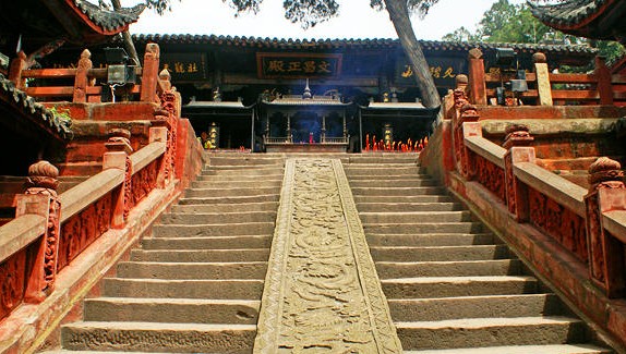 迈进帝乡大门,首先看到的是中间嵌有九龙石壁的二十四级石阶,二十四级石阶象征传统的“二十四孝”,巨型九龙石壁显示出文昌帝宫的帝王等级。