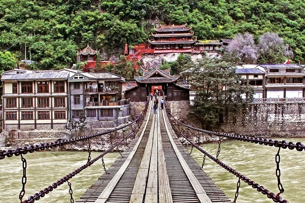 发展历史:泸定桥两岸的桥头古堡为传统木结构古建筑,泸定桥俯瞰为中国独有。该桥始建于清康熙44年(1705年),建成于康熙45年(1706年)。康熙御笔题写"泸定桥",并立御碑于桥头,两岸桥头堡为木结构古建筑,风貌独特系国内独有。中国工农红军在长征途中“飞夺泸定桥”,使之成为中国共产党重要的历史纪念地。