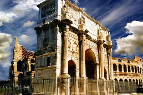 古罗马时代共有21座凯旋门,现今罗马城中仅存3座,君士坦丁凯旋门就是其中的一个。它位于古罗马角斗场西侧,其上的雕塑精美绝伦、恢宏大气,千年逝去,版权所有山东聊城聊之旅国际旅行社有限公司,已是残迹斑斑,却仍在风雨中,与古罗马角斗场共同见证罗马的辉煌。这座拱门上面的绝大多数装饰品其实都是取自于以前的皇帝们所建造的各种建筑物,这也表明罗马的艺术已经开始走下坡路了。所以说,处在拱门上端(顶阁)两侧的那8座矩形浮雕(rectangularrellefs)原先是一座纪念马库斯奥里列阿斯(161—180)的建筑物上的装饰,只是这位皇帝的头像被重新雕刻成了君士坦丁的样子(还有3座浮雕和它们属于同一系列,现存卡匹托尔博物馆。它们清楚地显示着马库斯·奥里列阿斯皇帝的样子)。