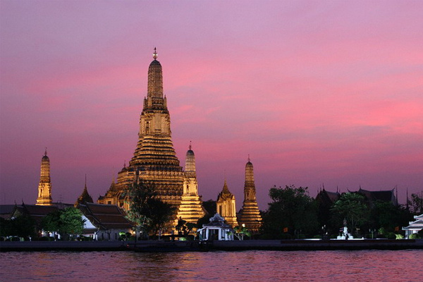 在湄南河及其支流上游览,最引人眼球的,要算是那些宏伟壮丽、金光闪闪的寺庙、佛塔。这一群群多姿多彩的佛教建筑,与市内高层建筑、居民住宅混建在一起,构成一道奇特、亮丽的风光。导游介绍:庙宇建在河左岸的较多,曼谷市内约有一万多间,所以泰国享有“千佛之国”、“黄袍之国”的声誉。在湄南河及其支流两岸,有几座著名的寺庙:一是玉佛寺,它与大王宫相连,整座佛寺装饰得金碧辉煌,富丽堂皇。大雄宝殿内供奉的翡翠玉佛(释迦牟尼),是泰国最重要最有价值的镇国之宝。二是郑王庙,位于湄南河西岸。它曾被定为郑昭王(郑昭王之父是华人)的御用寺院,其最富吸引力的建筑物是位于正中的“拍攀”大塔。这塔高79米,在晨曦之际,阳光照射,宝塔的顶峰会发出万丈光芒,因此寺庙又被称为黎明寺。三是卧佛寺,又称菩提寺,它与郑王庙正好隔岸相望,是曼谷最老和最大的寺院。寺内供奉着一尊独特大卧佛。这里一向被视为泰国第一所民间教育中心,故享有“泰国第一大学”之美誉。此外还有王孙寺、金佛寺、云石寺、金山寺等著名寺庙。