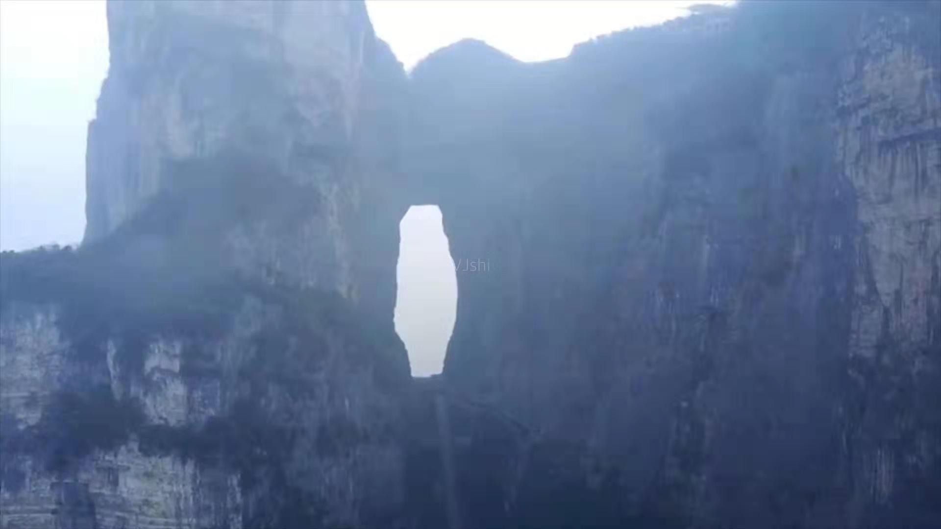 空旷而明朗,洞门前后的山峰,都很低,惟有此山独尊。一洞空明,除悠悠白云,就是融融蓝天,一尘不染。所以给1999年的飞机穿越此洞提供了绝好的条件。