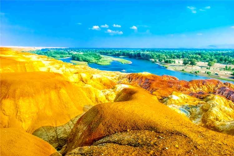 齐斯河,与对岸葱郁青翠的河谷风光遥相辉映,可谓“一河隔两岸,自有两重天”。河岸岩层抗风化能力强弱不一,轮廓便会参差不齐,而岩石含有矿物质的不同,又幻化出种种异彩,因此得名“五彩滩”。