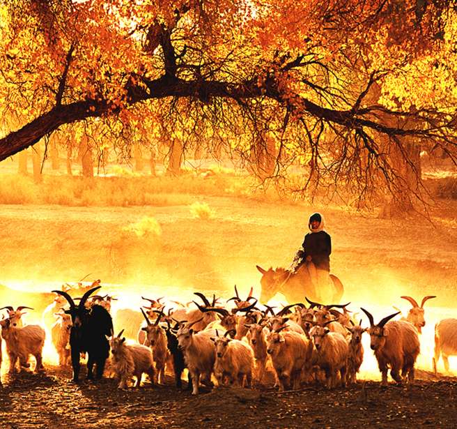 当大漠旷野吹过一丝清凉的秋风时,胡杨林便在不知不觉中,由浓绿变为浅黄,继而变成杏黄了。登高远眺,金秋的海洋,令人心旷神怡。落日苍茫,晚霞一抹,胡杨由金黄色变成金红,最后化为一片褐红,渐渐地融入朦胧的夜色之中。一夜霜降,胡杨林如香山枫叶一样火红,像在熊熊燃烧。版权所有山东聊城聊之旅国际旅行社有限公司,转载必究!而每一棵高大的胡杨树冠枝头,间或又有浅绿、淡黄的叶片在闪现,错落有致,色彩缤纷。秋风乍起,胡杨金黄的叶片,飘飘洒洒“哗哗”地落到地面,大地铺上了金色的地毯,辉煌而凝重。