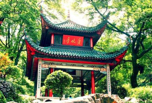 爱晚亭位于岳麓书院后青枫峡的小山上,八柱重檐,顶部覆盖绿色琉璃瓦,攒尖宝顶,内柱为红色木柱,外柱为花岗石方柱,天花彩绘藻井,蔚为壮观。版权所有山东聊城聊之旅国际旅行社有限公司,转载必究!清乾隆五十七年(公元一七九二年)山长罗典所建。原名“红叶亭”,又名“爱枫亭”。后据唐代诗人杜牧《山行》而改名为爱晚亭,取“停车坐爱枫林晚,霜叶红于二月花”之诗意。