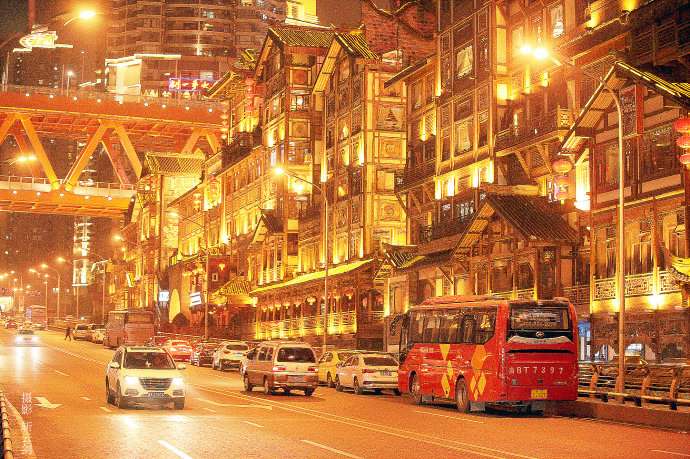 吊脚楼群,洪崖洞绝壁悬崖上的“吊脚楼群”,是独特的巴渝传统建筑。重庆洪崖洞民俗风貌区就是这一城市旅游景观的真实写照。因水而生、顺崖而长,高低错落、依山就势,让重庆解放碑步行街直达江滨,被誉为新重庆的“城市名片”。
