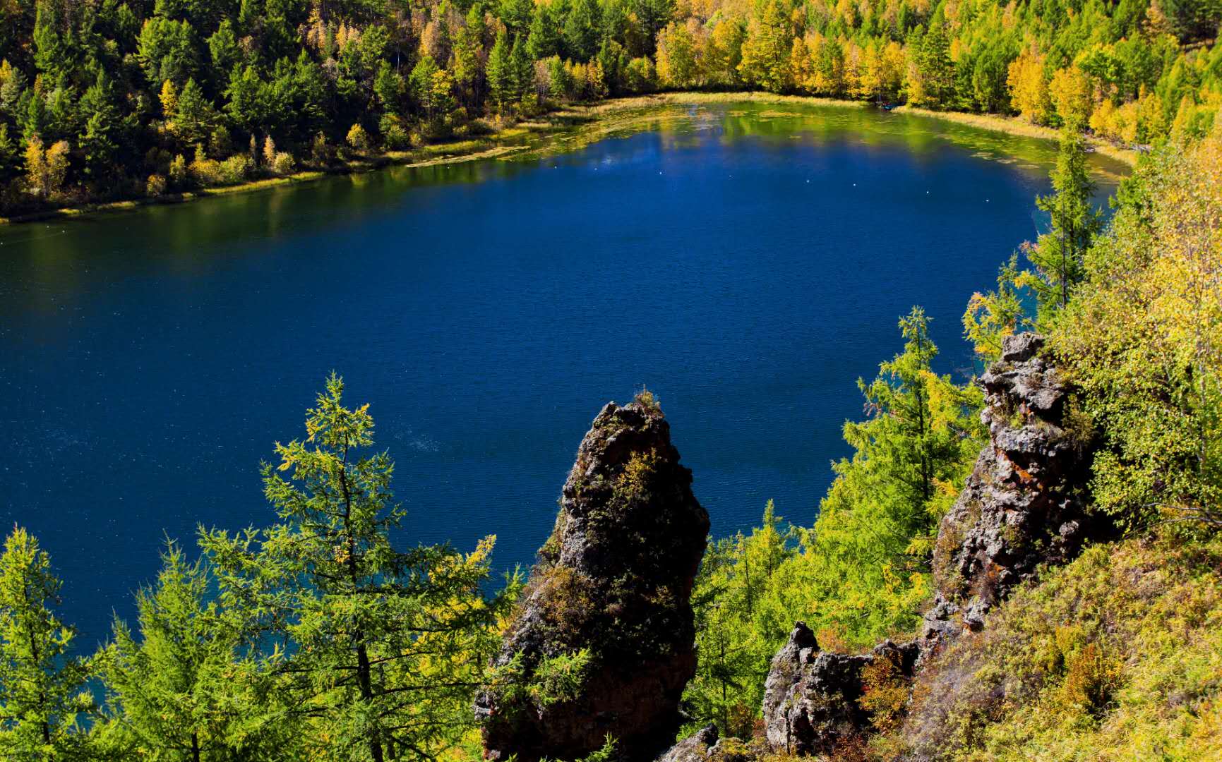 阿尔山天池,位于阿尔山市东北74公里的天池岭上,由火山喷出物落在喷火口周围形成一道环状围墙,中间形成圆形凹坑,多年积水而成。