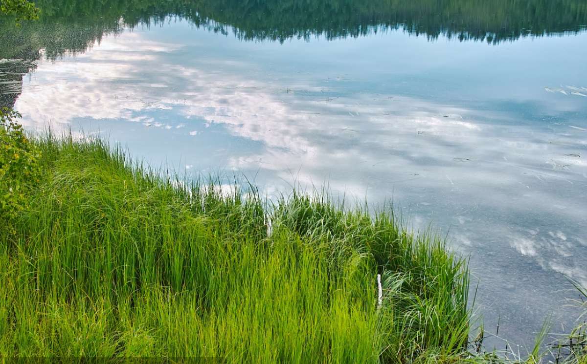 阿尔山天池像一块晶莹的碧玉,镶嵌在雄伟瑰丽的高山之巅,四周被茂密的森林和野杜鹃团团簇拥。池水深不可测,神奇的是,久雨水位不升,久旱水位不减。水平如镜,倒映着青山绿树、蓝天白云。每到春夏之交,山中水气郁结,山头薄雾缭绕,杜鹃怒放,合围池畔,构成了天池独特的自然景观。