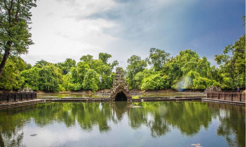 涅盘宫(Neak Pean)的意思是缠绕的巨蛇,就这么小小的神庙,在水中央,在蓝天白云的衬托下,亭亭玉立,美得像一颗水中明珠。