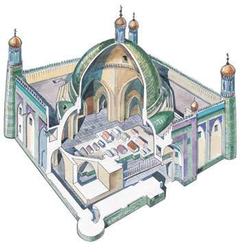阿尔斯兰汗墓座落在距喀什市中心东南部2.5公里的吐曼河高埠之上。其东部是一座占地8亩左右的清真寺,前有宽7.4米、高10米的巨大砖砌门楼,内有贮水池与礼拜殿,是上陵园朝拜之前的诵经之处,也是附近村民平日做礼拜的地方。 [28]