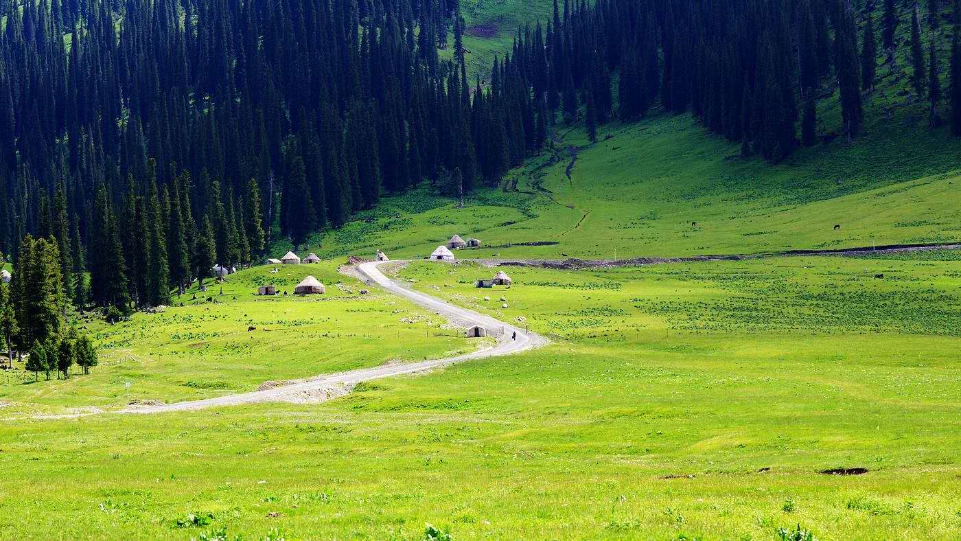 从夏塔古城向南一走到入山口,道路两边一个高过一个的高大土堆幕鳞次栉比,向人们展现了乌孙时期国力的强大与草原文化的具体内涵,入山以后,自然景色渐渐秀丽,两边茂密的原始森林悬挂在人们视线内的半山腰,其中沟的西边有现代当地居民利用一个小山坡半自然地圈养鹿场;向南古道迂回攀升,异常险峻,在短短的一公里范围内,相对高度增加了200多米,在向山上走,前面豁然开朗。