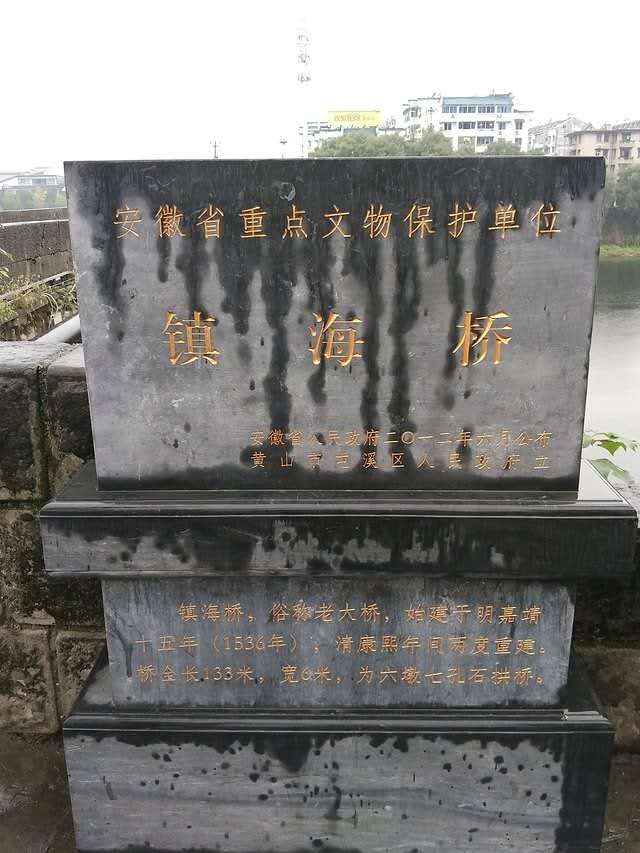 镇海桥又名老大桥,为明嘉靖十五年(1536年)始建,清康熙十五年(1676年)重修,清康熙三十四年(1695年)再遭水毁,清康熙三十八年(1699年)再度重修,是连接屯溪老街和黎阳古镇的交通枢纽。镇海桥全长133米,宽15米,为六墩七孔石质拱桥,桥面和桥栏用茶园青石铺建。上部为等截面实腹式石拱,下部为浆砌条石重力式墩台。桥墩呈等腰三角形,分水头石头翘起,造成船头状。镇海桥是屯溪历史重要的建筑标志,是安徽省不可多得的明代大型石拱桥之一,具有很高的历史、文化、科学价值。