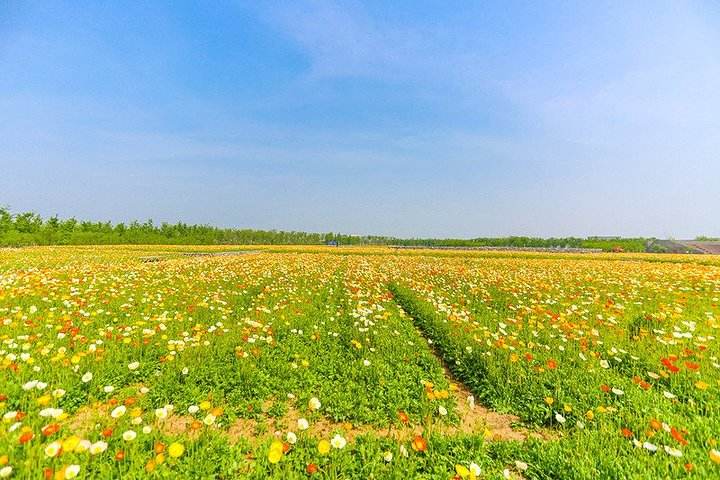公园内的“衲田花海”,总面积2220亩,由612块花田 “缝补”拼接而成,融合了北方旱梯田的雄浑和南方水梯田的俊秀,与僧人袈裟异曲同工,又兼具纳祥聚福之意,朴质却熠熠生辉。这里栽植着50多种花卉,自南向北形成黄、红、紫三大色区,呈现出海纳百川之态、兼容并蓄之美。站在全长2.3公里的彩虹桥俯瞰花海,听花开花落,嗅浓郁芬芳,感受浓浓的原乡情怀。