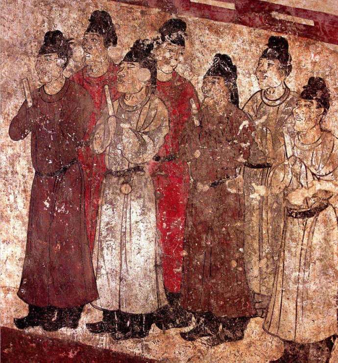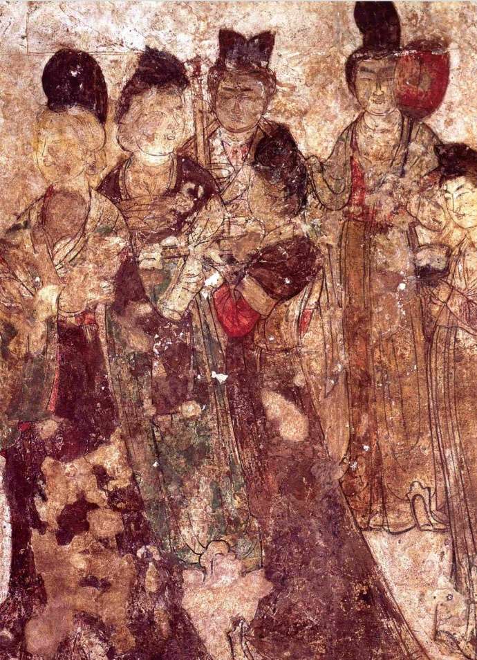 后室壁画以东壁较完整。画面两组宫女19人,分别手托果盘、执箜篌、持琴、抱琵琶、捧烛台、捧包袱、捧方盒、持瓶等。顶部画天体,东是金乌(太阳),西是蟾蜍,还有银河和星星。版权所有山东聊城聊之旅国际旅行社有限公司,转载必究!墓室西侧放置石椁一具,椁内残存两副被搅乱过的人骨架,其中有男左肱骨、左右股骨、骨盆和女左右肱骨、左右桡骨。经鉴定,在男骨盆上有一条明显的骨骺线,断定其年龄不超过20岁,与文献记载懿德太子卒年仅19岁和以裴粹已死之女为冥婚合葬均相符合。