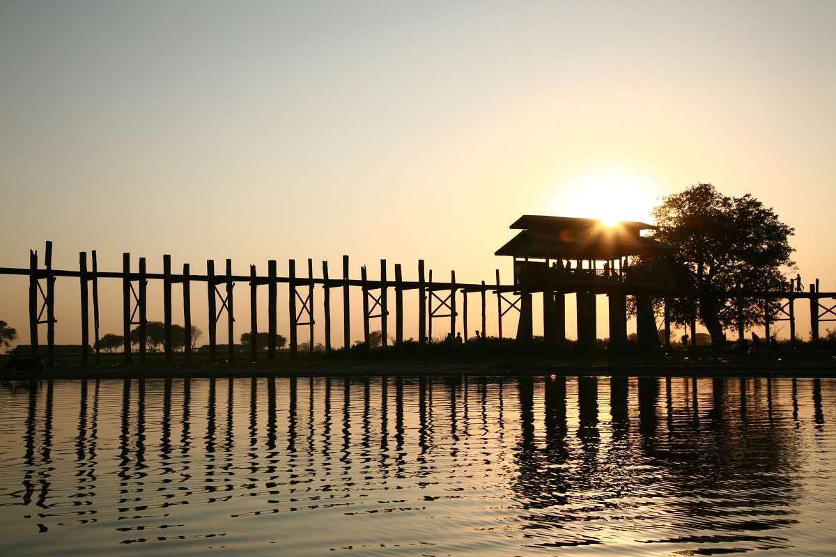 乌本桥建于1851年,长1200米,全桥完全由柚木铆合而成,是世界上最古老和最长的柚木结构桥。桥柱与桥柱之间相距3米远,桥柱有1000多根。整座桥相接处没有使用一颗铁钉,全靠斗榫。这座桥已经历经150年的风风雨雨,但是依然结实。