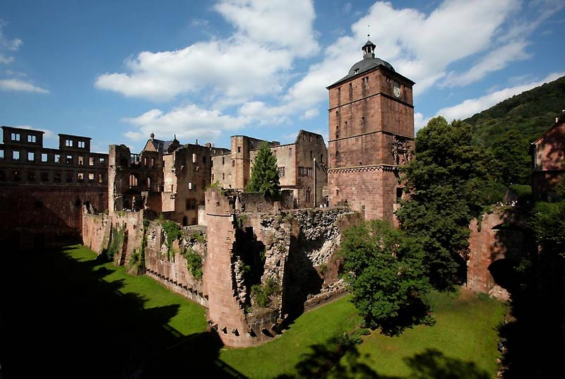 海德堡城堡坐落于国王宝座山顶上,名胜古迹非常多,历史上经过几次扩建,形成歌特式、巴洛克式及文艺复兴三种风格的混合体,德国文艺复兴时期的代表作。古堡的正门雕有披着盔甲的武士队,中央庭园有喷泉以及四根花岗岩柱,四周则为音乐厅、玻璃厅等建筑物。古城现在多数的房间是开放给游客参观,保存完好的一些大厅,目前仍可供宴会以及艺术表演之用。站在城廓上远望,满眼尽是无边无垠的葡萄园,美不胜收。堡中能储存220000公升葡萄酒的“大酒桶”以及大酒窖,是海德堡城内最吸引观光客的原因。