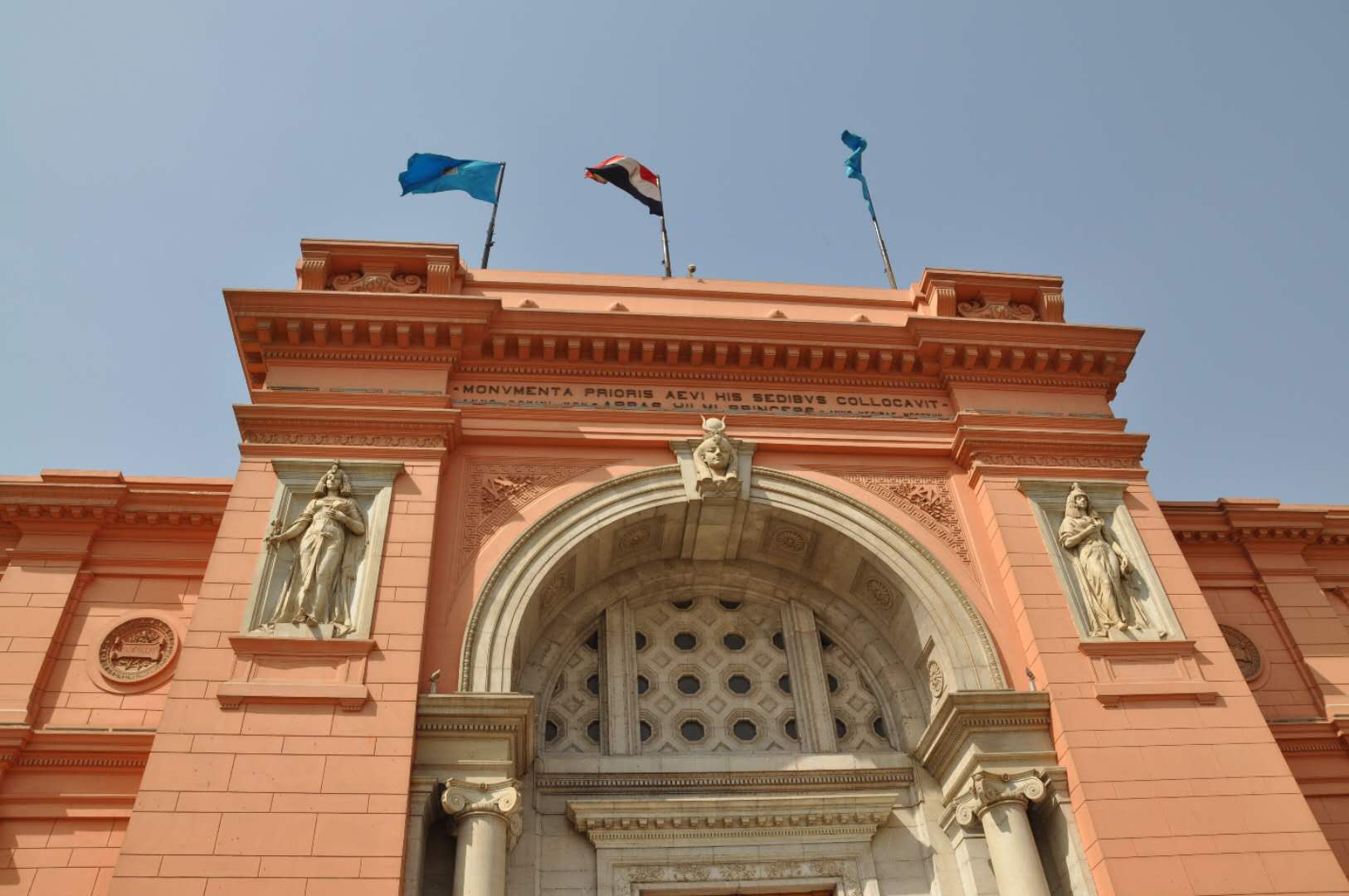 博物馆入口的设计融入了古埃及艺术的特征:大门的外廓是一个圆形拱门,拱门两侧的壁龛中各有一个将法老形象欧式化的浮雕,其中一个持有纸莎草,另一个持有莲花,分别象征古代埃及的南北方。