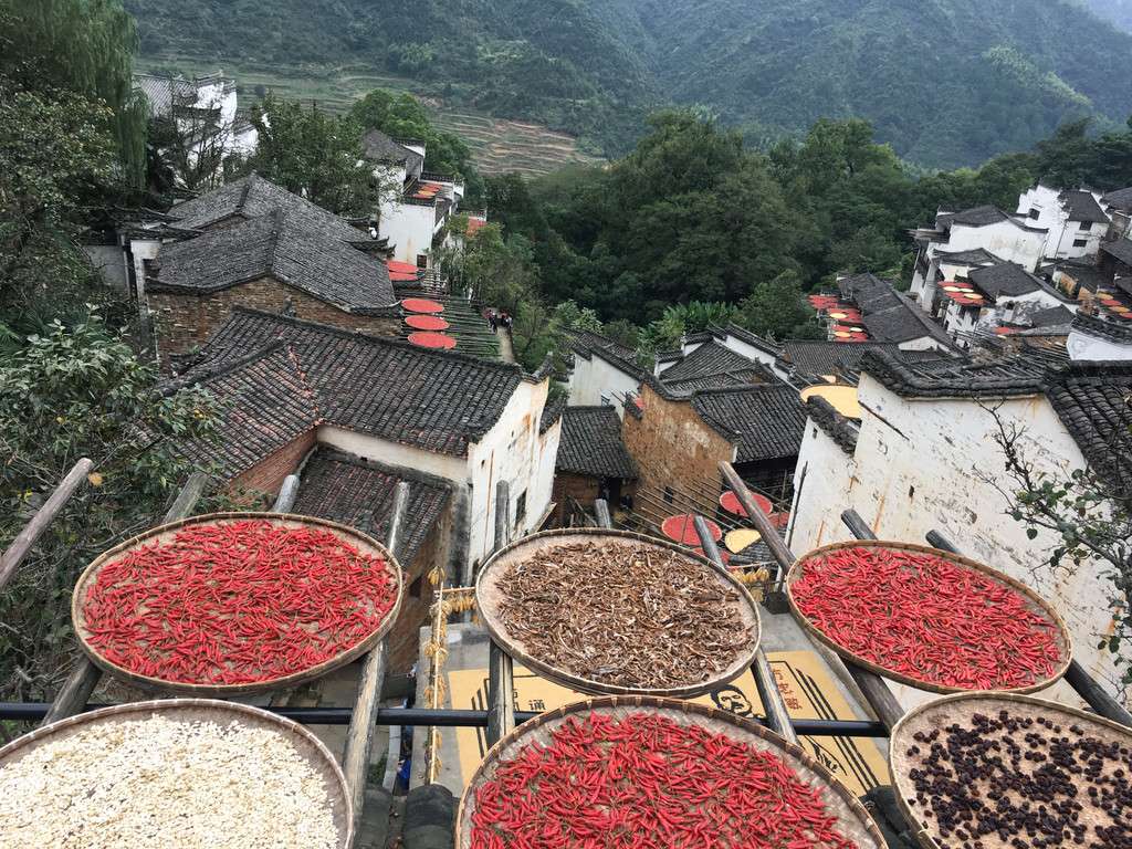 为庆祝首个“中国农民丰收节”,篁岭家家户户房前屋后晾晒的农作物,将篁岭古村装扮。 古村内有乡村美食、农耕体验等系列活动,打麻糍、磨辣椒、做月饼,游客与农民一起庆丰收、晒丰收、享丰收。