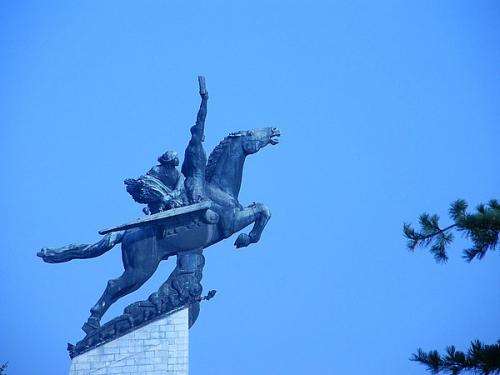 朝鲜千里马铜像矗立在万寿台的丘岗上,是1961年4月 15日,在伟大领袖金日成同志的49寿辰之际建立的。座基是用360多种2,500多块不同规格的花岗岩垒起来的,铜像为一匹伸展双翅的骑有工人、农民的 “千里马”。