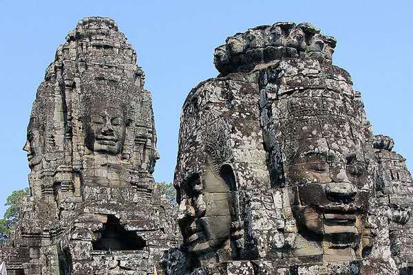 巴戎庙 位于柬埔寨暹粒,吴哥城内最为出名的要数巴戎庙中的佛塔了,巴戎庙位于吴哥城的中心位置,巴戎庙是由一组共49座小宝塔围绕中央尖塔构成的建筑群,这些塔在佛语里又被称做浮屠,每一座塔的四面都雕刻着巨大的佛面,也正因为如此,这些塔又被称作佛面塔,上面的佛被称为四面佛。