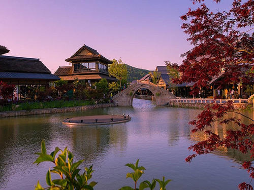行走其中,木制的唐风建筑与桥梁,让清雅禅意扑面而来,街道两旁所有的建筑、景观都像是会呼吸般的浑然天成,使人感到如同进入一个充满禅意的世界中。