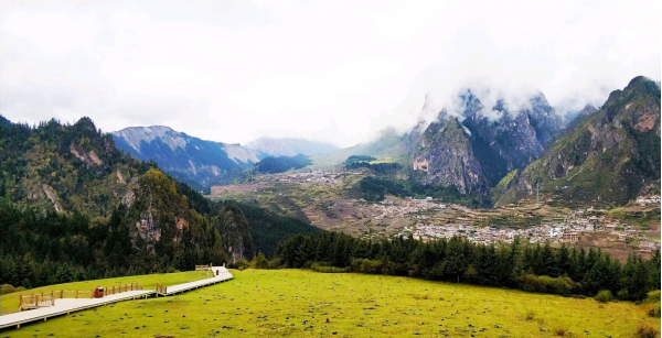 在群山环绕之中,有一处大片的草坪,平整的木栈道,那就是仙女滩,在这里可以一览无余的饱览整个扎尕那山峰的全景。