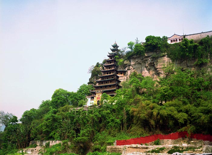 石宝寨是一座拔地而起四壁如削的孤峰 清乾隆初年,借助架于石壁上的铁索在山顶修建了一座寺庙,嘉庆年间又聘请能工巧匠研究如何取代铁索上山,于是便依山取势修建这座九层楼阁 从此,香客及游人可免攀援铁索之苦,上楼直达山顶,1956年又加以修建改为12层,如今这里已成为游客眺望长江景色的"小蓬莱"了。