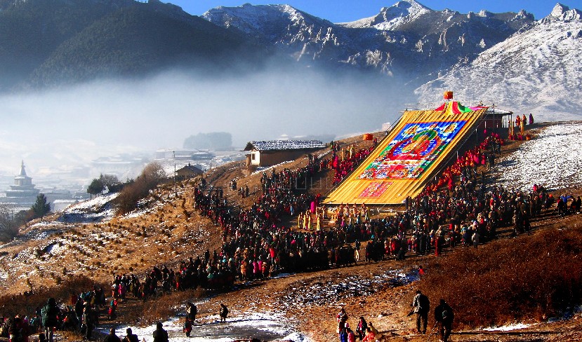 其中有1757年清代乾隆皇帝赐予该寺镶满金银珠宝、书有汉满蒙藏四种文字的盔甲,国家特级文物、纯金汗书写而成的藏文《大藏经》中的整套《甘珠尔》佛经,由十六罗汉和四大天王等组成的整套二十四幅的缂丝唐卡“唐绣”,这些文物都展示出明清两代中央政府和西藏地方之间的亲密关系。其中二十四幅要展示三周,形成了该寺一年一度规模盛大的“甘丹绣唐节”。