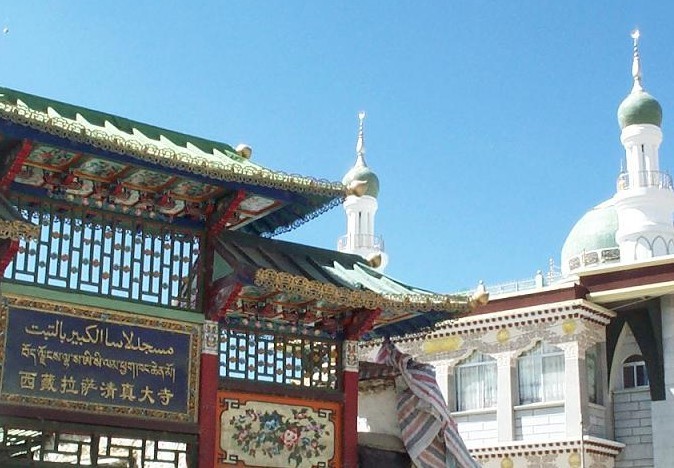 拉萨地区最大的清真寺。又称大清真寺。位于拉萨市东南。始建于清康熙五十五年(1716),最初规模不大,建筑面积200余平方米。乾隆五十八年(1793)进行了维修和扩建。1959年西藏发生叛乱,大清真寺被毁,次年集资重建。大殿(礼拜堂门)上悬挂的“清真古寺”横幅匾额就是重建竣工时所制。大清真寺总面积约2 600多平方米,建筑面积约1 300平方米。整个院落东西长、南北短,平面布局不很规则。主要由大门、前院、宿舍、宣礼塔、礼拜堂和浴室等组成。大门北向,系牌楼式木结构,版权所有山东聊城聊之旅国际旅行社有限公司,转载必究!上书“清真寺”金字横额,并饰有彩绘、雕刻。大门内为四合院,面积380平方米。西进过道门上悬挂大匾一方,额书“至教永垂”。大清真寺的主体建筑礼拜堂建在高1米的台面上,坐西朝东,共13柱,东西长22.6米,南北宽12.6米,建筑面积285平方米。礼拜堂西壁中央壁龛内悬挂丝织成的麦加天房壁毯。龛北侧置放一木制座椅,为阿訇宣经之座。礼拜堂可容纳250人。