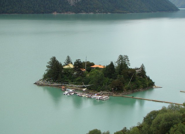 到湖心的扎西岛可以坐手拉的“船”(一排用浮木做的筏子,摆渡人拉着一根横跨两岸的钢缆迎来送往)。扎西岛上经幡飞扬,玲珑的措宗工巴寺(意为湖中城堡)属藏传佛教中宁玛派(红教)寺庙,供奉莲花生大师,至今已有1500年历史了,光是寺中的传说就数之不尽。沿顺时针方向转岛,还可以看到格萨尔王战马留下的蹄印、挥剑于石头上留下的剑痕、桃抱松、以前的水葬台、树叶上有自然形成的藏文字母的“字母树”、莲花生洗脸的神泉……可谓步步有神奇。