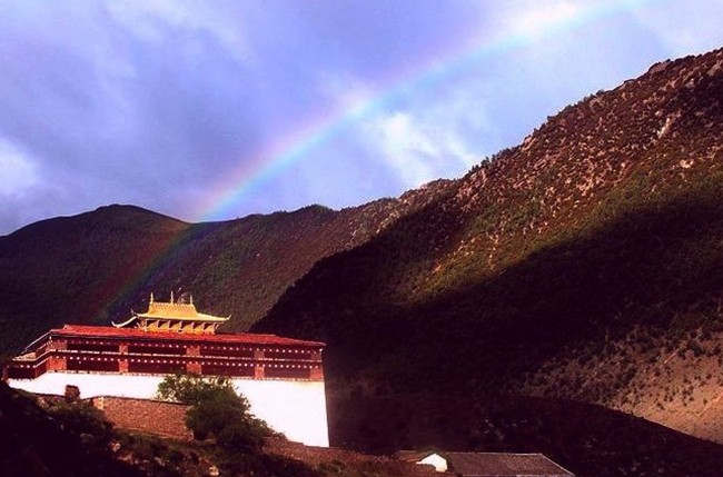 雍布拉康据传说建于公元前二世纪,那个晕头晕脑就做了吐蕃第一代藏王的聂赤赞普,除了成为“脖子作宝座的英王”外,还得到了这座特意为他而建的三层“红柳香莎宫”。这故事其实听着挺耳熟,俗点儿说就跟听到谁谁忽然间中大奖,一下子就奔有房有车的“高级阶段”的故事似的,现在宫殿二层墙壁的壁画上还绘有这段传奇故事,让我一类的后人为之景仰不已。由此,这座宫殿也成为历代吐蕃赞普的王宫,直到第三十三代赞普松赞干布统一高原,将王都迁往拉萨。不过,即使英明神武如松赞干布,也不敢忘了雅砻这块吐蕃的根本之地,不时还回来居住,据说文成公主远嫁到西藏后的第一个夏天就是在雍布拉康度过的。雍布拉康还有一神奇之处,自第一代聂赤赞普以来,历代赞普皆以苯教为护国教,直到第二十八代赞普拉妥妥日年赞时期。传说有一日天降“神物”于雍布拉康的顶上,内有经书、法器和咒语若干,可是当时谁也不识这些东西的奇妙,只知是些好东西,于是将之供奉起来,还取了一名叫“宁波桑哇”,意思是秘室。直到后来许多年以后,才有后人识出密室中的《诸佛菩萨名称经》等珍贵经卷,方悟出其实佛教在松赞干布时期以前早就进入了西藏了,只是因当时地上的苯教势力太盛,才只好先“空投”,再“埋伏”,以待后日。该宫殿随之成为佛教圣地,也由此变成了一佛殿,成为许多高僧大德修行之地,也成为许多“伏藏”的发现和埋藏之地。