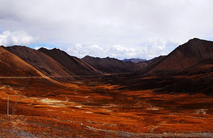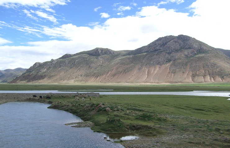 位处昌都地区三江流域之高山深谷中的邦达草原是一块地势宽缓、水草丰美的高寒草原。怒江支流玉曲上游蜿蜒流淌其中,两岸广阔的低湿滩地上生长着茂密低矮的大蒿草、苔草之类的草甸植物,绿茵如毡,除成群牛羊在那里游荡觅食外,偶尔也会有一些藏原羚出没于其间。图上所示为冬季时节的邦达草原,牧草已趋枯黄,显得有点萧索荒凉,缺少些许生机。然而因位处西藏东部,降水稍多于西藏中西部地区,牧草生长状况较好,这里是西藏境内较为优良的天然草场,畜牧业比较发达。