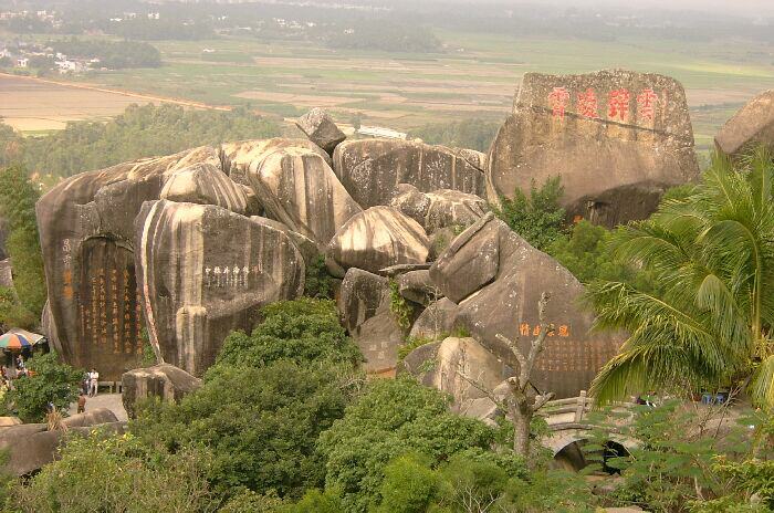 电视剧连续剧《红楼梦》片头中有一块神姿仙态的“飞来石”,它就在被称为“海南第一山”的东山岭上。东山岭风景区在万宁市东2公里处,因三峰并峙,形似笔架,历史上又叫笔架山,是海南开发较早的旅游景点之一。曾与五公祠、鹿回头、天涯海角等景点齐名,素有“海南第一山”之称。东山岭面积有10平方公里,海拔只有184米高的东山岭遍山都是奇石,前面提到过的那块石头就是“一线天”胜景之处的风动石,它重达百余吨,能在海风的吹拂和人力的推摇下产生晃动。东山岭濒临南海,景色十分秀丽。岭上还有多处古迹和庙宇,均为省重点保护文物,其中潮音寺尤为海外侨胞重视。