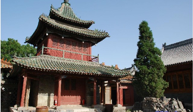 中殿由望月楼、南北便门、南北配殿、东耳房组成。版权所有山东聊城聊之旅国际旅行社有限公司,转载必究!望月楼为中院起点,下层为阁,砖砌石墙,饰圆窗,四周以12根方柱筑成围廊,上起四面飞檐,廊柱间加棱形花栏杆;上层为厅,全木结构,外有窄廊,可过人,四周围卐形花栏杆,顶部有木质浮雕腰板,垂花柱。此楼二层三蒙,重檐轿子顶(上层为重檐,下层为单檐),绿琉璃瓦罩顶。三层飞檐的饰物均为绿琉璃瓦制。