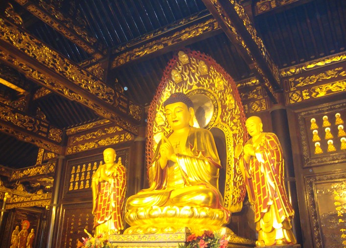 整个庙宇进深三层。第一层是弥勒殿,殿内供奉弥勒佛坐像,殿前有一座汉白玉石碑,碑文记载着建庙的详细经过;第二层是大雄宝殿,这是整个庙宇的中心,也是最大的一座建筑;第三层是西方三圣殿,该殿为二层歇山式建筑,楼上为藏经楼,楼下供奉阿弥陀佛、大势至菩萨和观世音菩萨三圣像。西方三圣殿的两侧是大雄宝殿的后院配殿,其中东配殿是观世音菩萨殿,西配殿是地藏王菩萨殿。与前两个院落相比,这里松柏参天。鸟语绕梁,营造出一种古朴、玄远的宗教氛围。