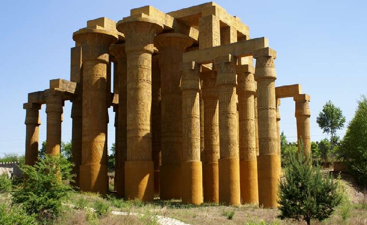 卡纳克神庙是埃及的雄伟高大的建筑群。公元前1870年,埃及法老下令修建了一片庙宇群,它由20多座神庙组成。它是法老敬献给太阳神和月亮神的最高礼物,经过三千多年的风雨侵蚀,现已残缺不全。这些石柱是遗址中具有代表性一部分,石柱上的图纹和象形文字,反映了当时古埃及人劳动、生活、敬神等情景。