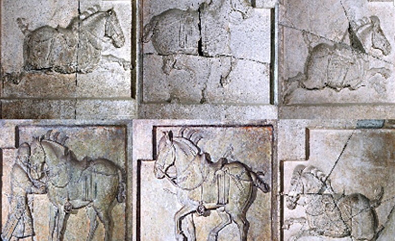在祭坛东西两庑房内置有6匹石刻骏马浮雕像,驰名中外,曾有诗云:“秦王铁骑取天下,六骏功高画亦优。”这是李世民自己选定的题材。他在隋亡以后,为统一割据的局面,巩固唐王朝新建的政权,南征北战,驰骋疆场,他骑过的六匹马,联系他的战叻。据说当时担任营山陵使、工部尚书、著名工艺家、美术家阎立德起图样,由筑陵石工中的高手雕镌而成的。这六具石雕骏马是在平面上起图样,雕刻人马形状的半面及细部,并使高肉突起,称之浮雕,也叫“高肉雕”。每边三具,皆背靠后檐墙而立。据记载,原石在每块上角有欧阳询书太宗自撰的马赞诗,随后另有殷仲容隶书刻于座上,这些今俱不可见,原诗收入《全唐文》中。六骏的名为“特勒骠”、“青骓”、“什伐赤'、“飒露紫”、“拳毛马呙”、“白蹄乌”。现存西安市碑林博物馆,其中“飒露紫”、“拳毛马呙”二骏,于1914年被盗运美国宾夕法尼亚大学博物馆。昭陵六骏刻于贞观十年,各高2.5米,横宽3米,皆为青石浮雕,姿态神情各异,线条简洁有力,威武雄壮,造型栩栩如生,显示了我国唐代雕刻艺术的成就。在“飒露紫”中表现了唐太宗在与王世充作战时为流矢所中,丘行恭进前为他拔箭那种亲切形象。昭陵的这些石刻在品类、造型及题材上,既不取生前仪卫之形,也不用祥瑞、辟邪之意,独具一格,所有石刻都是写实,富有政治意义的不同凡响之作。