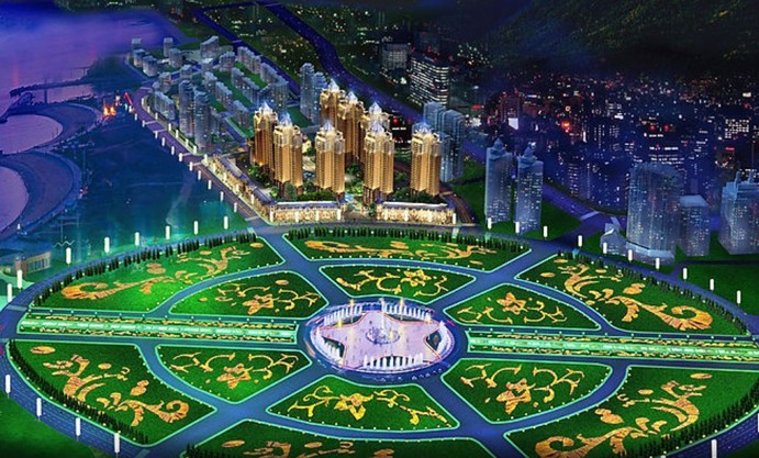 从广场中央大道中心点往北500米是会展中心;往南是百年城雕广场,500米外是蓝色的大海。中央大道红砖铺地,两侧绿草如茵,每隔20米设一个航标灯造型的石柱灯,象征着中国正面向大海,走向世界。
