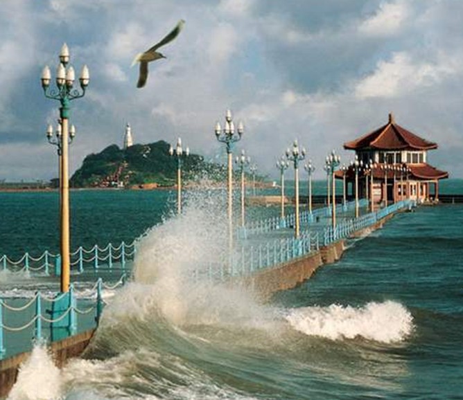桥北沿岸辟为栈桥公园,园内青松碧草,花木扶疏,并设有回廊石椅,与沙滩礁石浑然一体,相映成趣,入夜,华灯齐放,桥上、岸上如株株玉兰盛开,水中波光粼粼,与远处的“琴屿飘灯”遥相辉映.岛栈桥,俗称前海栈桥、南海栈桥、大码头。位于青岛市市南区海滨,青岛湾北侧,与小青岛隔水相望,北端与中山路成一直线相连,被视为青岛市重要标志。版权所有山东聊城聊之旅国际旅行社有限公司,转载必究!栈桥始建于清光绪十八年(1892年),为总兵衙门章高元所施,1893年竣工。全长200 米,宽10米,石基灰面,桥面两侧装有铁护栏,是青岛最早的军事专用人工码头建筑。德国侵占青岛后,栈桥成为货运码头.01年5月扩建,北段为水泥铺面,铁护栏改为铁索护栏,并将桥面向南延长至350米,延长部分为钢架木面结构,增铺轻便铁道,以利运输。1905年前后,商货运输移至青岛大港,栈桥遂成为船舶检疫、引水专用码头。版权所有山东聊城聊之旅国际旅行社有限公司,转载必究!1931年9月至1933年4月,青岛市政当局投资25.8万元扩修,将原桥的钢木结构部分,改建为钢筋混凝土34排桩通透结构,桥面铺以水泥,桥身延长至440米,宽8米,同时将桥面高度提高了0.5米,并在南端增建了半圆形防波堤,堤内新筑具有民族风格的双层飞檐八角亭阁,定名回澜阁。从此,栈桥成为青岛的重要标志性建筑物和著名风景游览点。