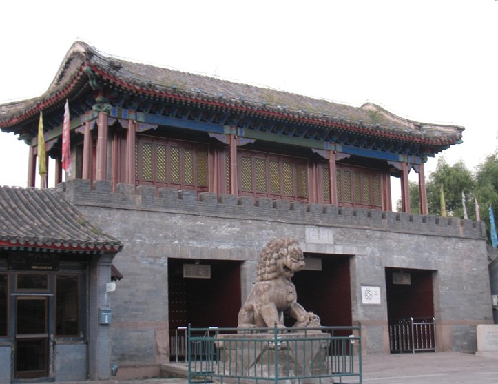 门前列石狮和下马碑,迎面有红照壁,门上有阁楼,下有3门,高敞宏伟。中门上方有乾隆题额“丽正门”三字,取《易经》“日月丽乎于天”之意,用汉、满、蒙、藏、维五种文字刻成。它和门内上方乾隆题诗“两字新题标丽正,车书恒此会遐方”,象征着国内各民族团结,国家强盛、统一。